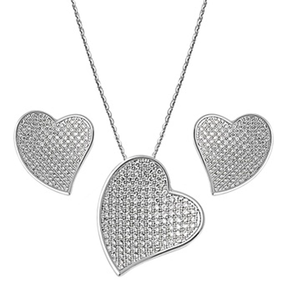 Micro Pave Heart Earrings Clear Simulated CZ .925 Sterling Silver Pendant Set