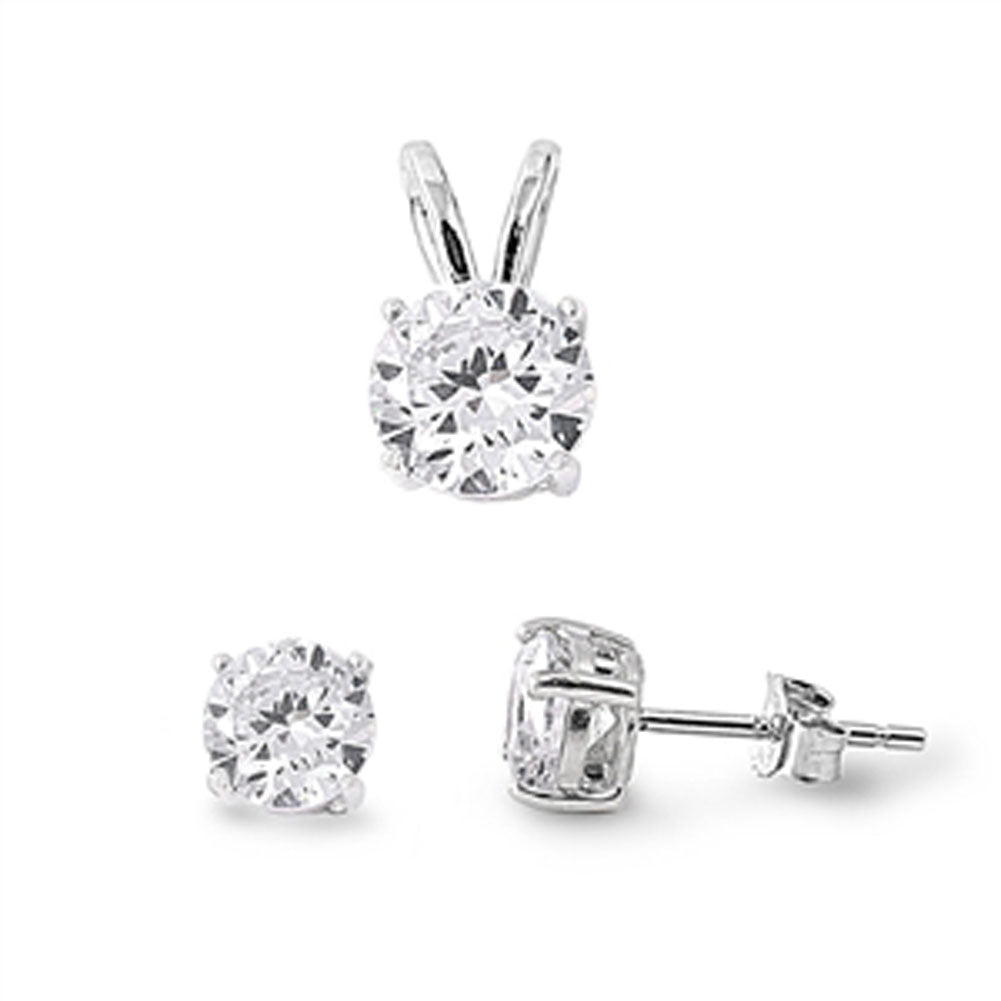 Solitaire Round Earrings Clear Simulated CZ .925 Sterling Silver Pendant Set