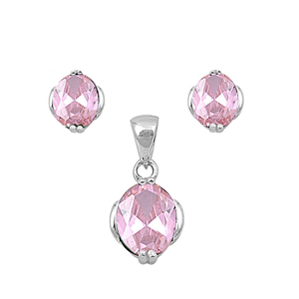 Solitaire Oval Earrings Pink Simulated CZ .925 Sterling Silver Pendant Set
