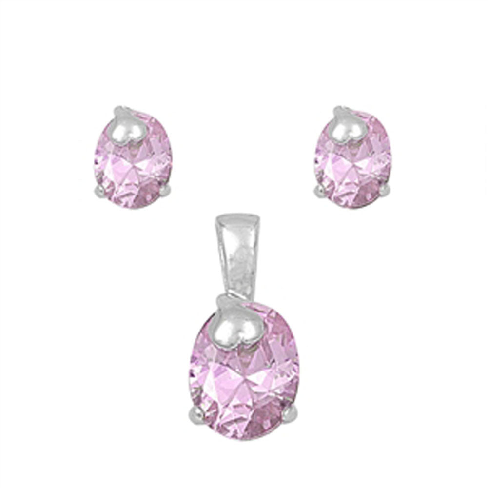 Solitaire Oval Heart Earrings Pink Simulated CZ .925 Sterling Silver Pendant Set