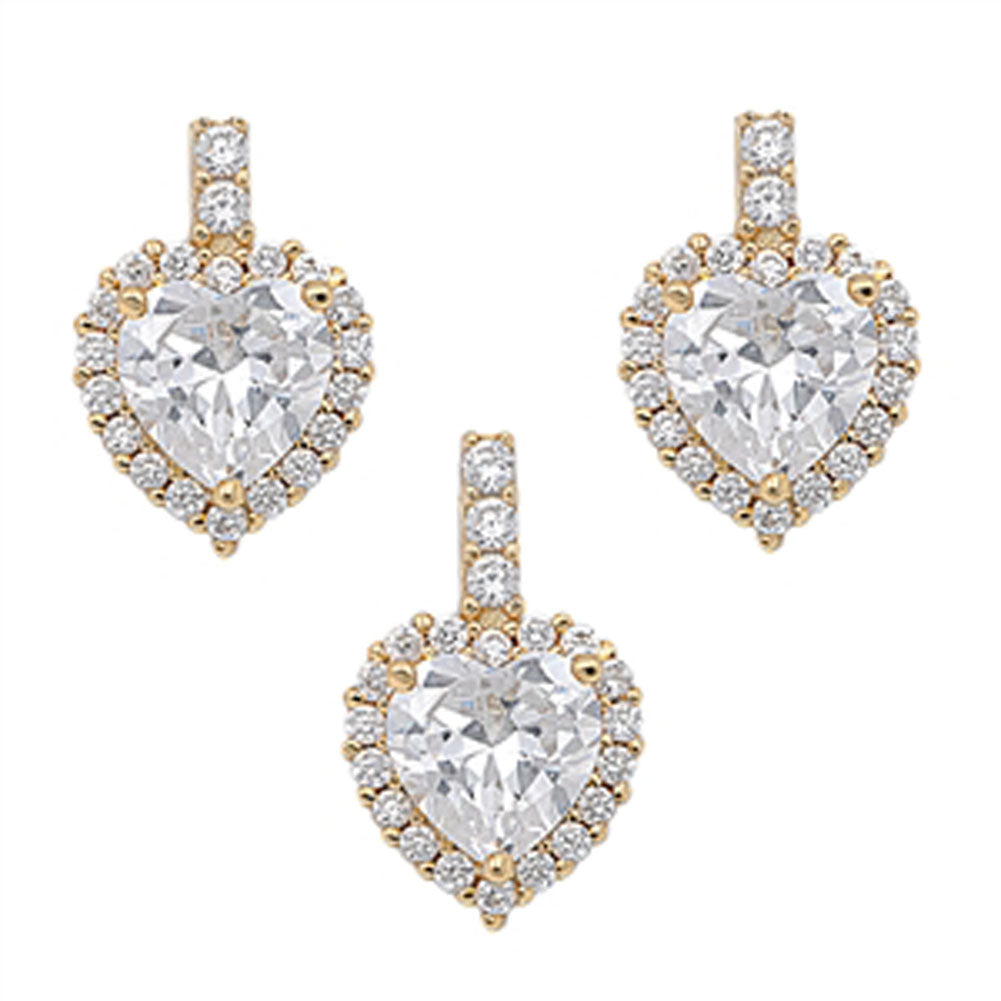 Gold-Tone Halo Heart Earrings Clear Simulated CZ .925 Sterling Silver Pendant Set