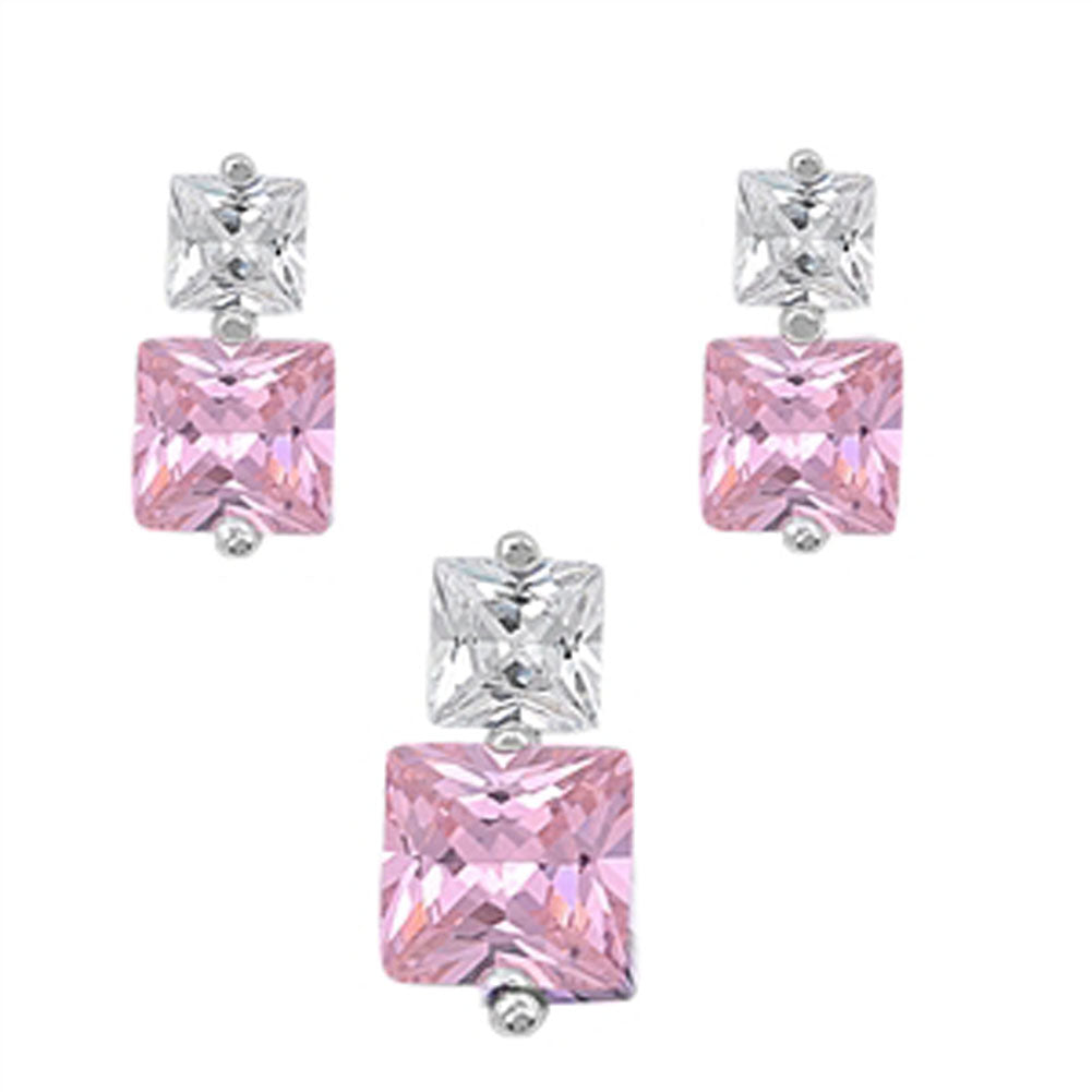 Square Square Earrings Pink Simulated CZ Clear Simulated CZ .925 Sterling Silver Pendant Set