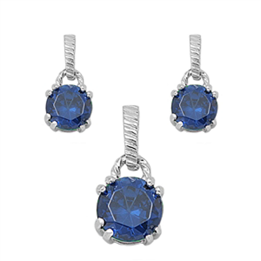 Solitaire Round Earrings Blue Simulated Sapphire .925 Sterling Silver Pendant Set