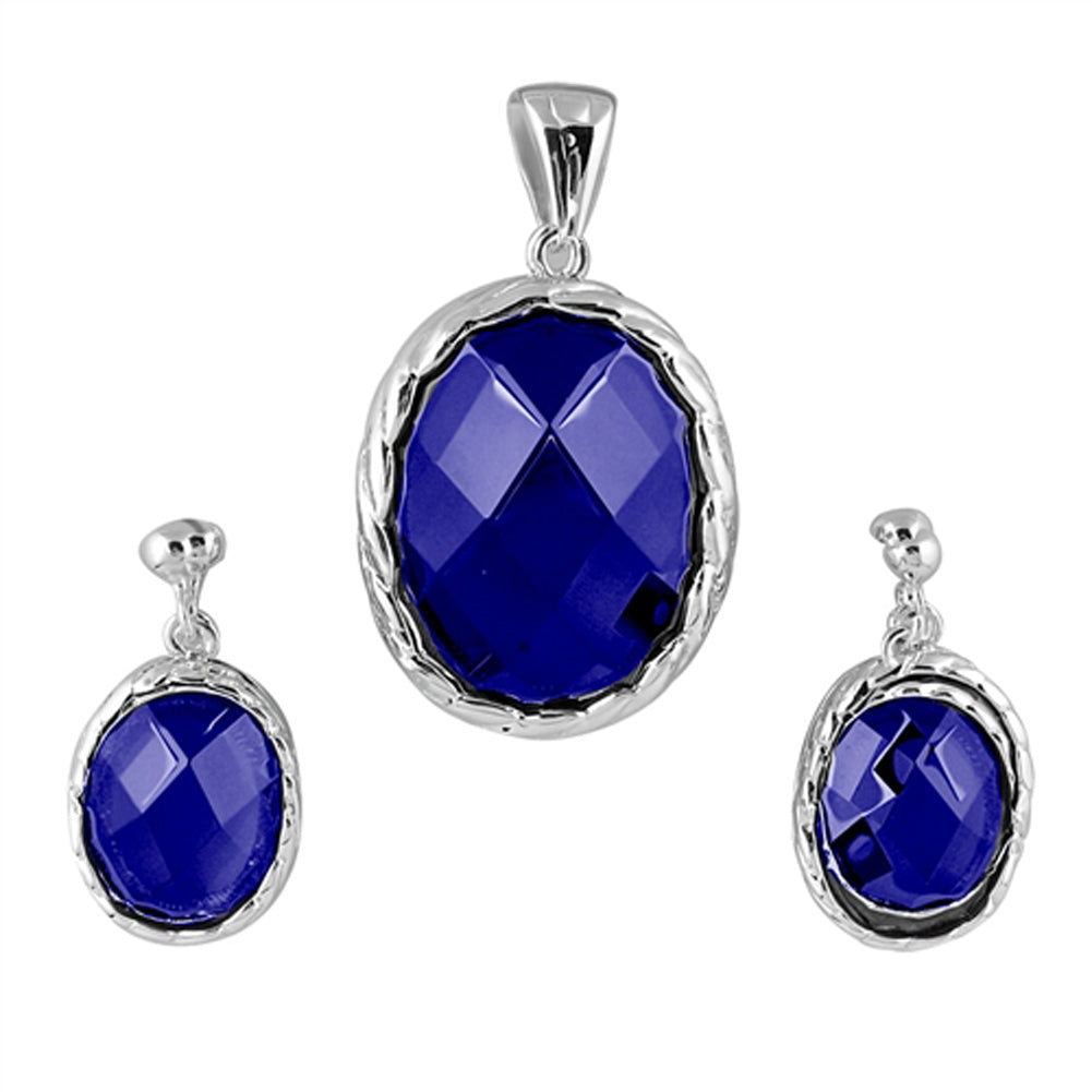 Rope Border Angle Cut Oval Vintage Style Blue Simulated Sapphire .925 Sterling Silver Earrings Pendant Set