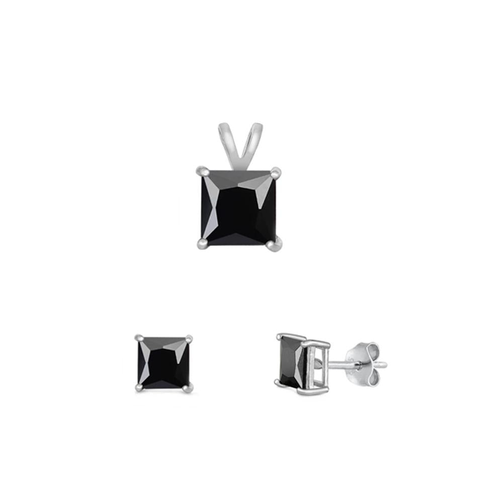 Sterling Silver Princess Cut 4mm Black CZ Earrings & 6mm Pendant Set 925 New