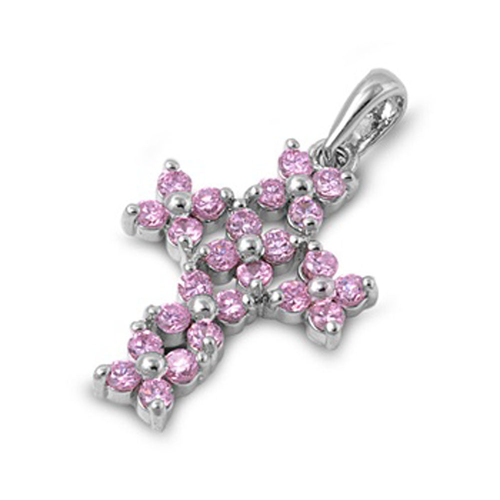 Bold Vintage Flower Cross Pendant Pink Simulated CZ .925 Sterling Silver Charm