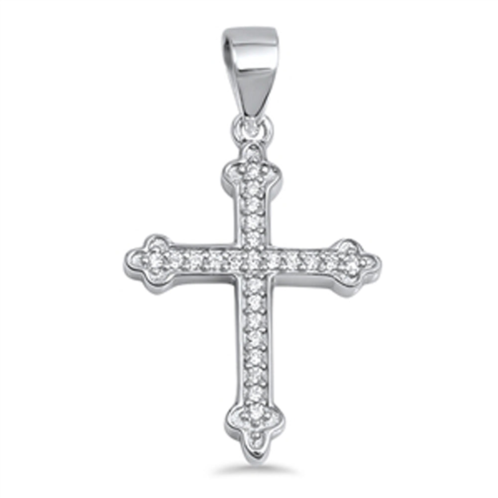 Studded Bud Cross Pendant Clear Simulated CZ .925 Sterling Silver Ornate Charm
