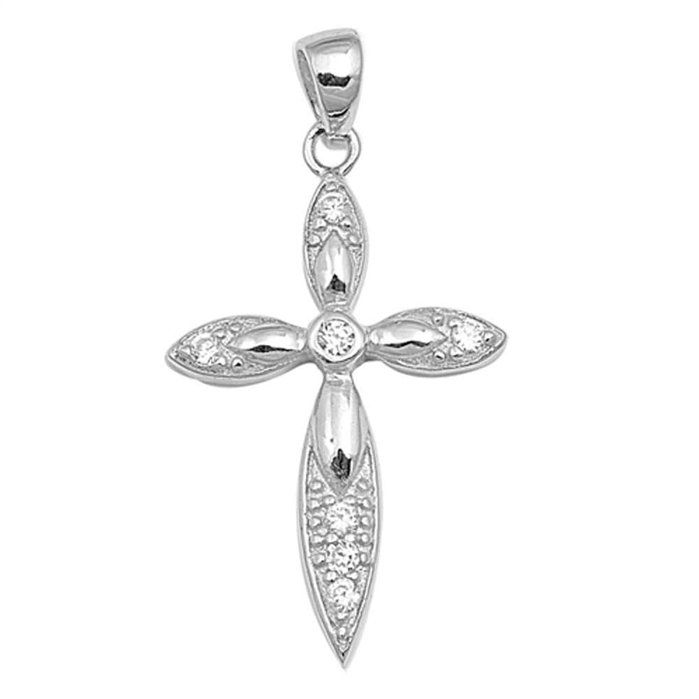 Sterling Silver Traditional Pointed Studded Cross Pendant Clear Rhinestone Charm
