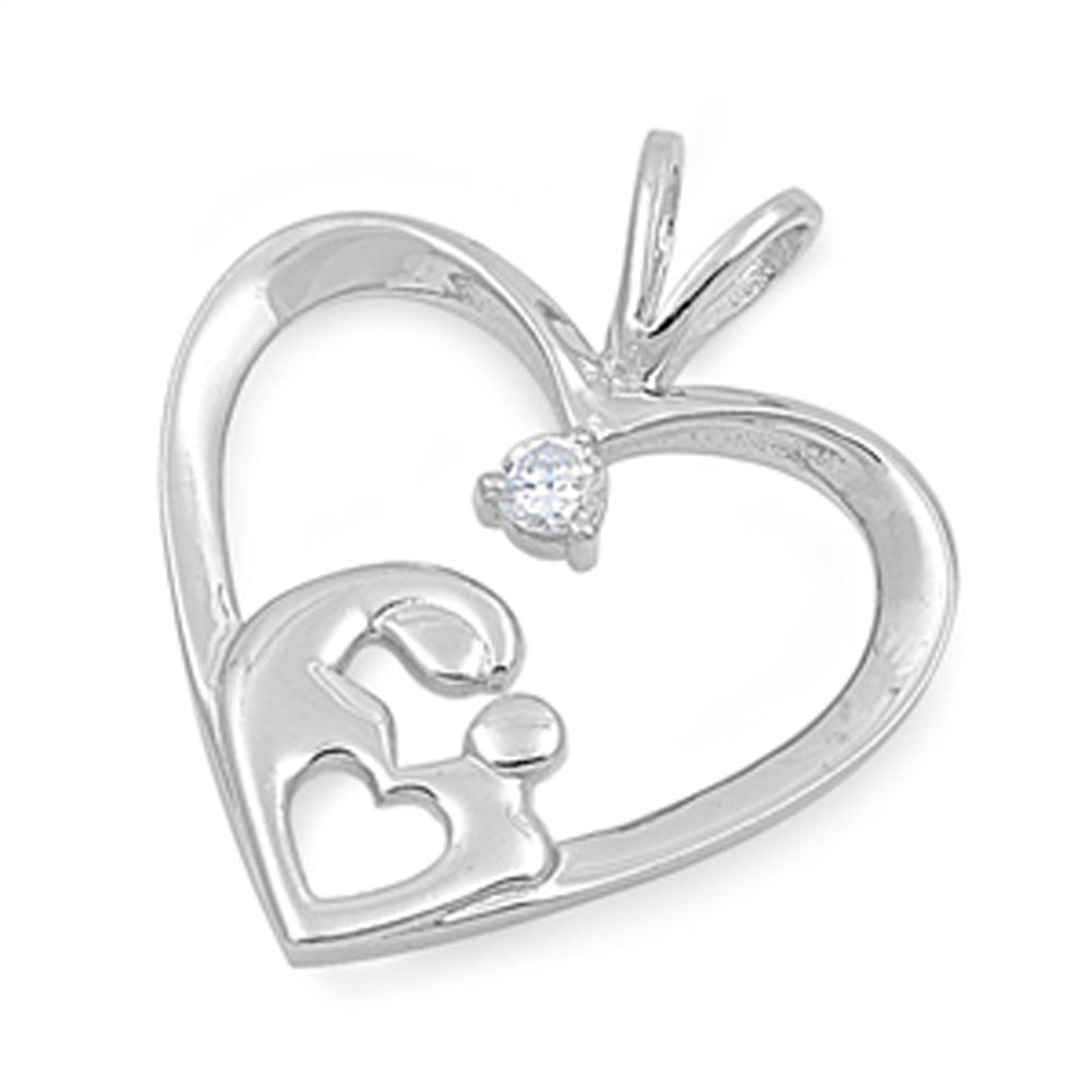 Sterling Silver High Polish Mother Slider Heart Pendant Clear Simulated CZ Charm