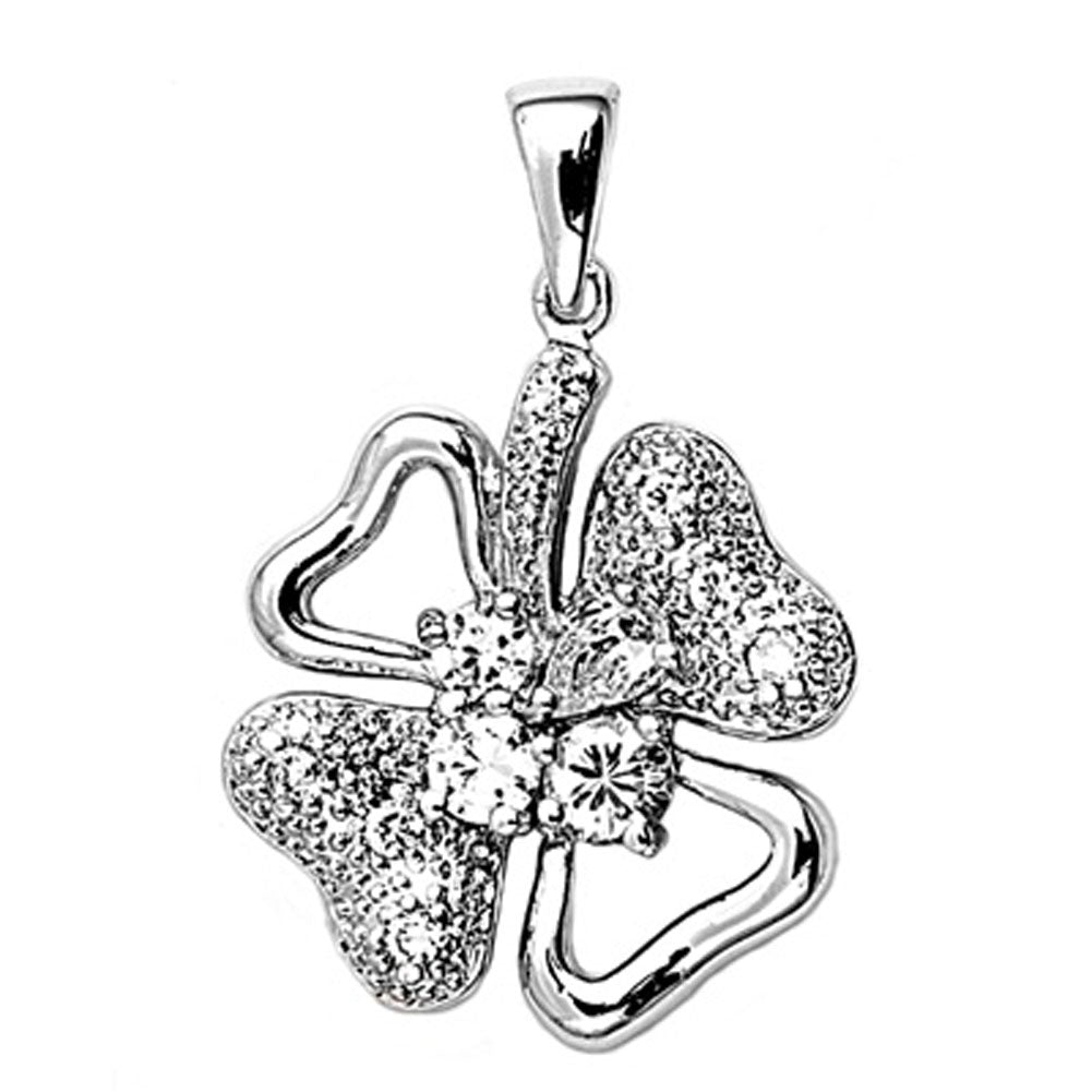 Sterling Silver Heart Elegant Studded Clover Pendant Clear Simulated CZ Charm