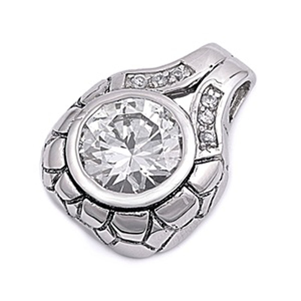 Etched Round Solitaire Pendant Clear Simulated CZ .925 Sterling Silver Charm