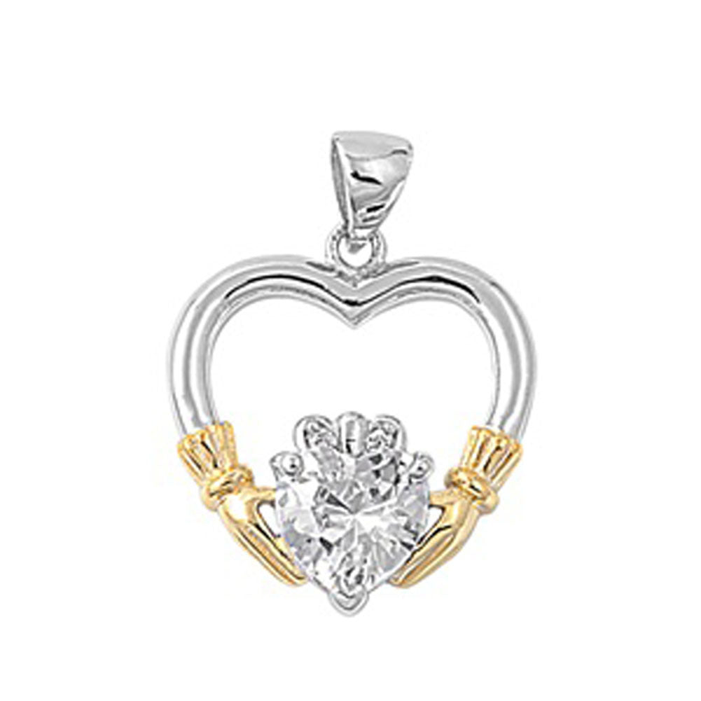 Heart Dual Tone Claddagh Pendant Clear Simulated CZ .925 Sterling Silver Charm