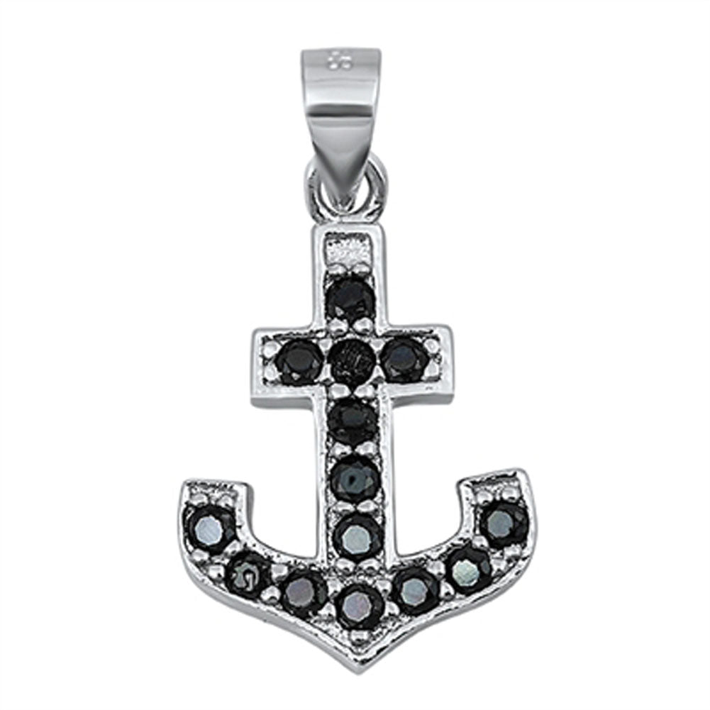 Studded Anchor Pendant Black Simulated CZ .925 Sterling Silver Sailor Charm