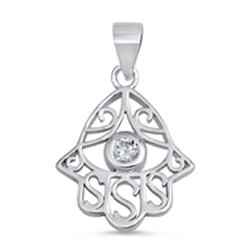 Sterling Silver Hand of God Elegant Cutout Hamsa Pendant Clear Simulated CZ