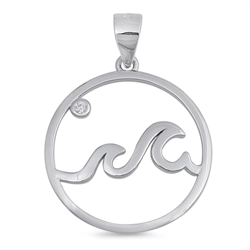 Ocean Open Circle Wave Pendant Clear Simulated CZ .925 Sterling Silver Charm