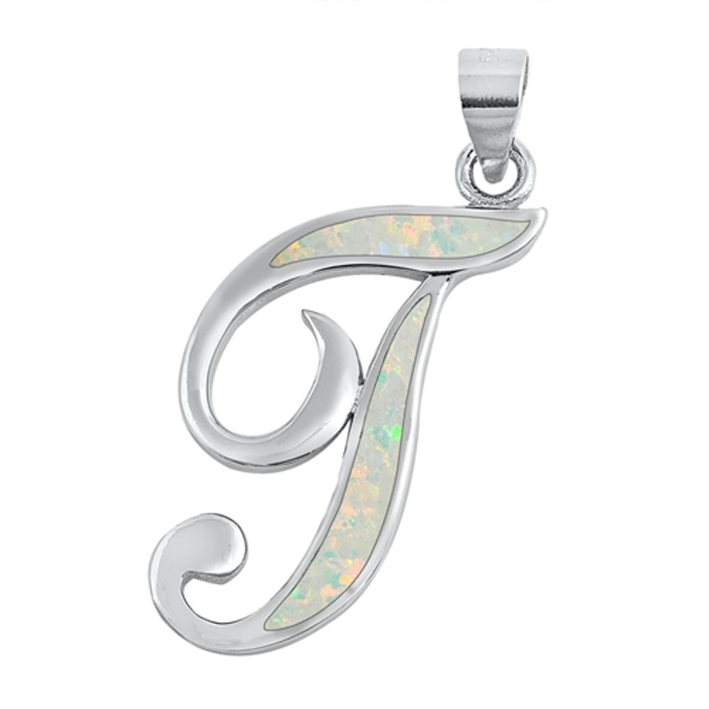 Sterling Silver Beautiful White Synthetic Opal Initial "T" Pendant Script Charm