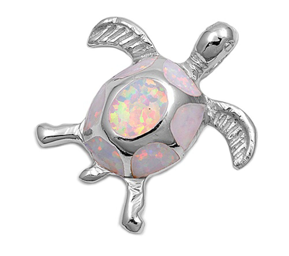 Sterling Silver Ocean Swimming Sea Turtle Pendant White Simulated Opal Charm