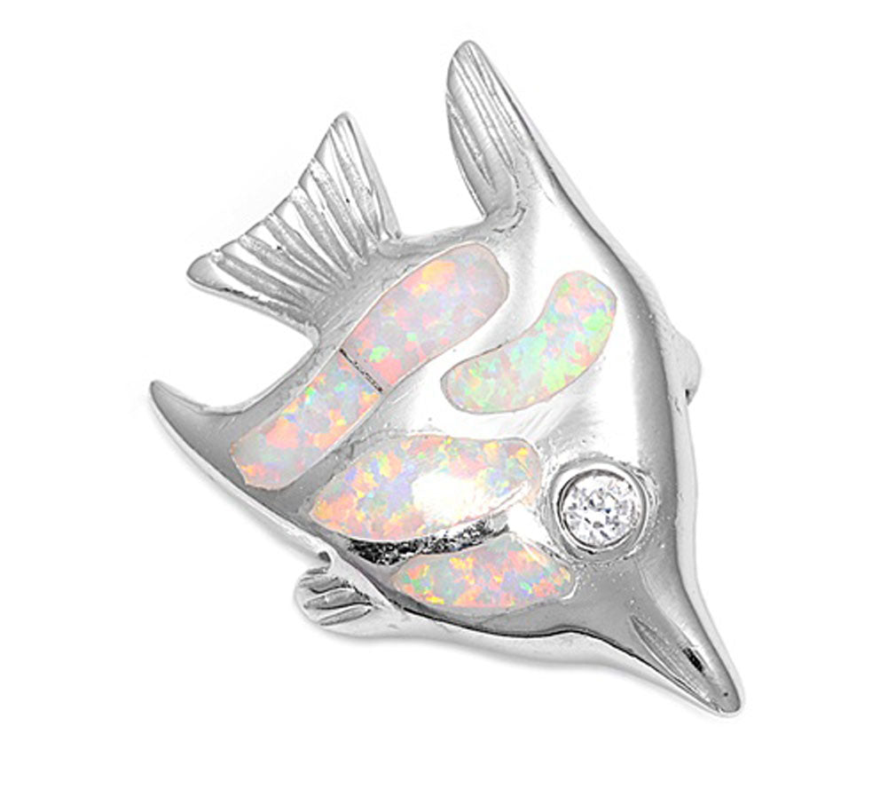Sterling Silver Tropical Swimming Angel Fish Pendant White Simulated Opal Charm