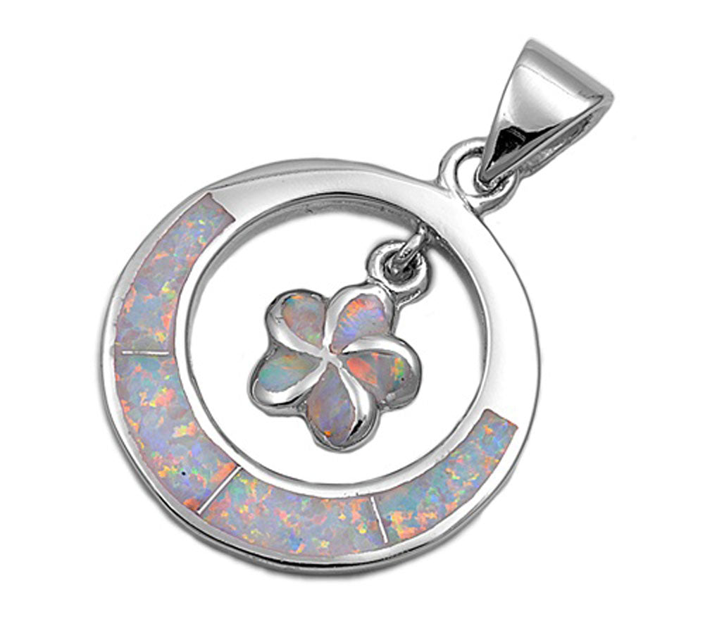Sterling Silver Circle Plumeria Dangle Hoop Pendant White Simulated Opal Charm