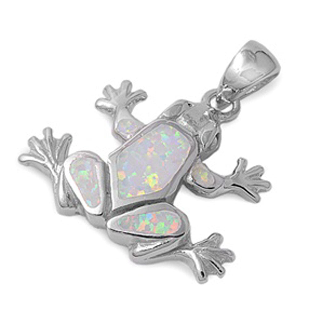 Cute Mosaic Frog Pendant White Simulated Opal .925 Sterling Silver Animal Charm