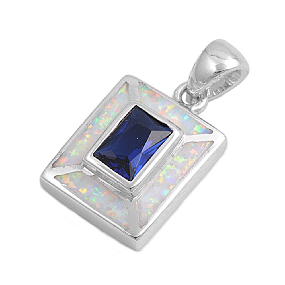 Sterling Silver Elegant Rectangle Box Pendant Blue Simulated Sapphire Charm