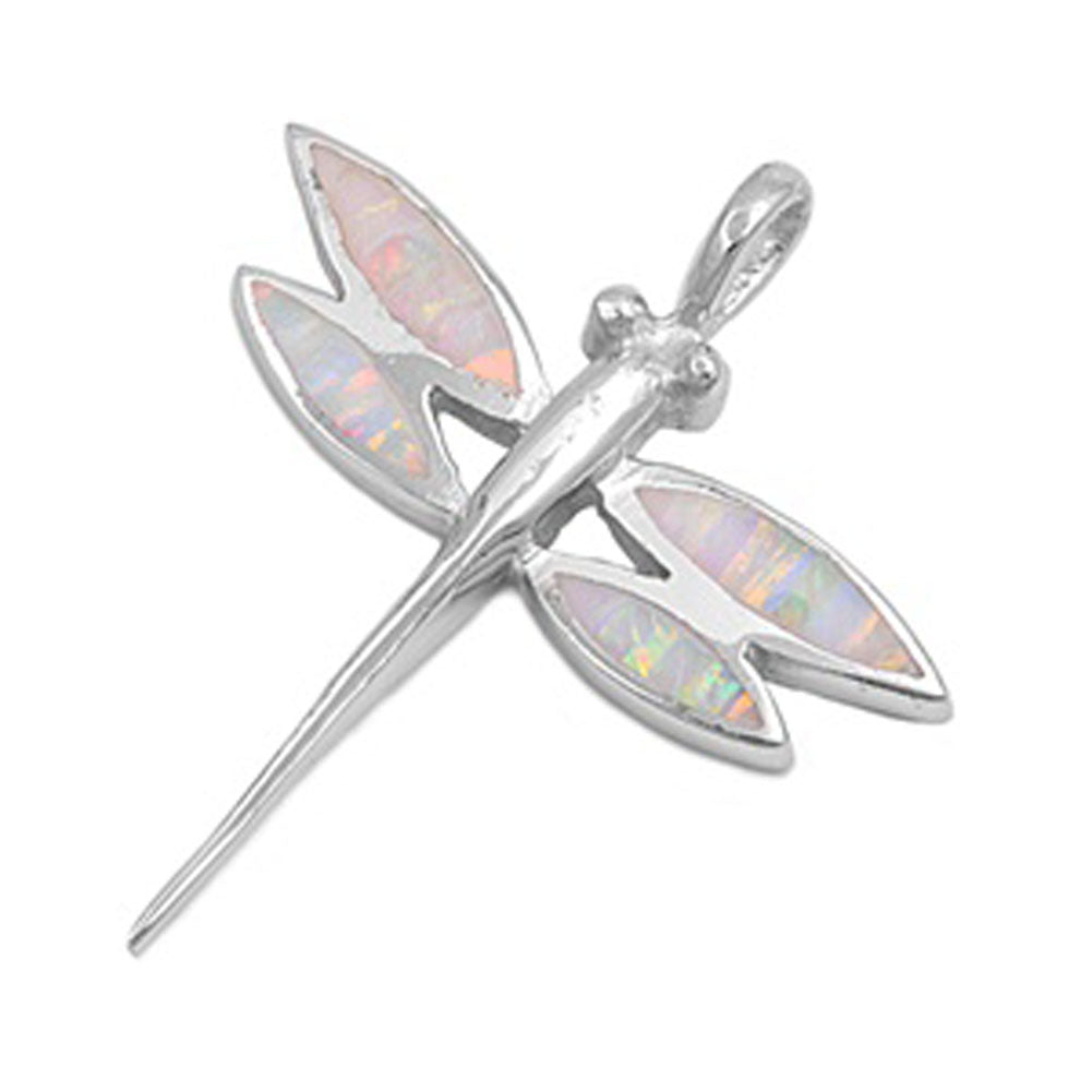 Sterling Silver Unique Elongated Dragonfly Pendant White Simulated Opal Charm