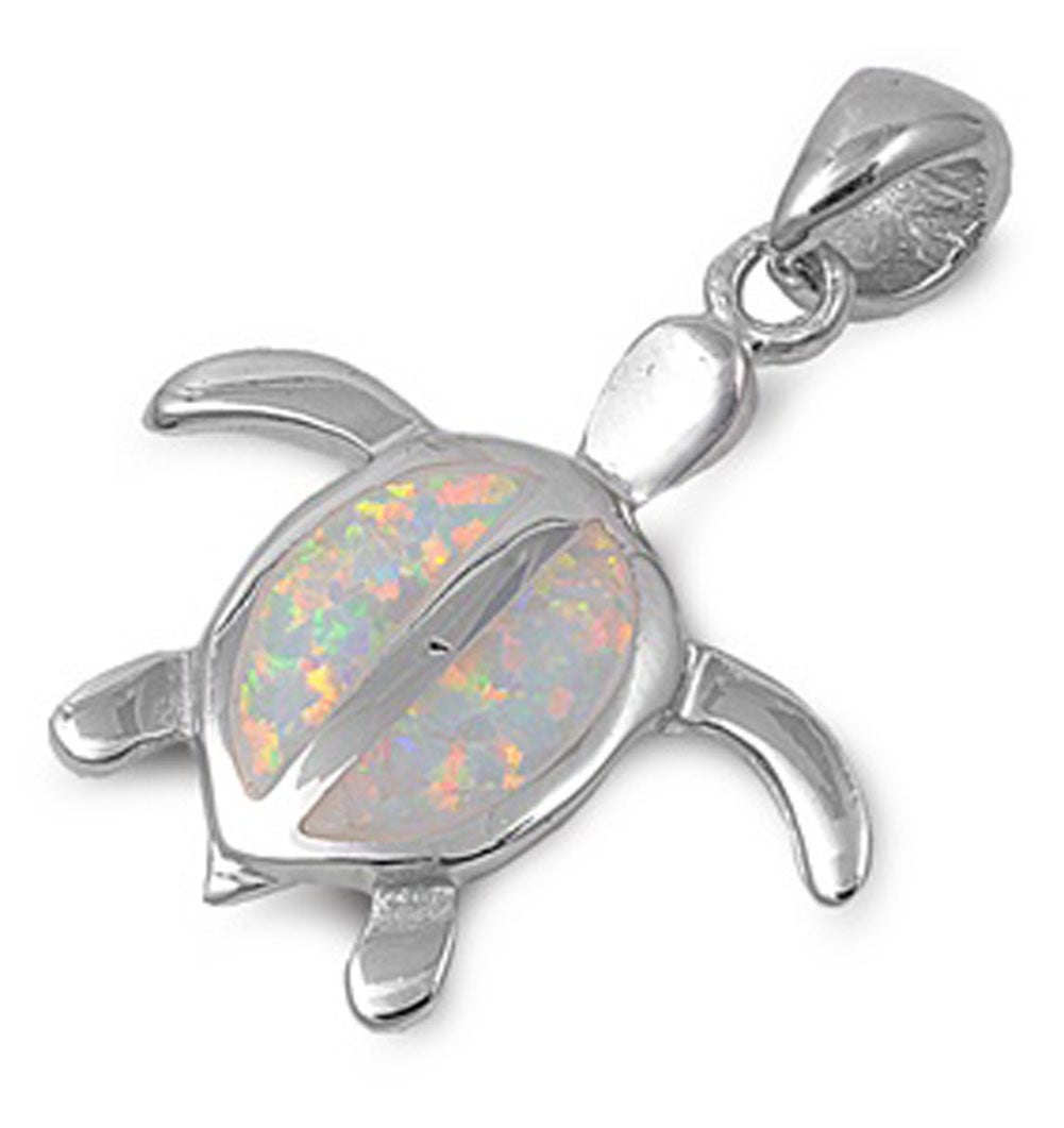 Sparkly Turtle Pendant White Simulated Opal .925 Sterling Silver Animal Charm