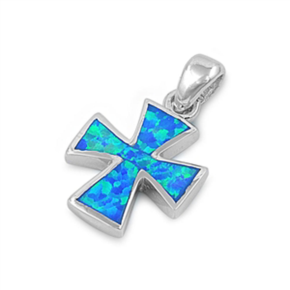 Stylized Angular Cross Pendant Blue Simulated Opal .925 Sterling Silver Charm