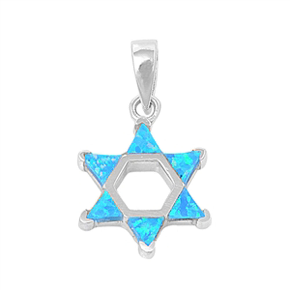 Star of David Pendant Blue Simulated Opal .925 Sterling Silver Religious Charm