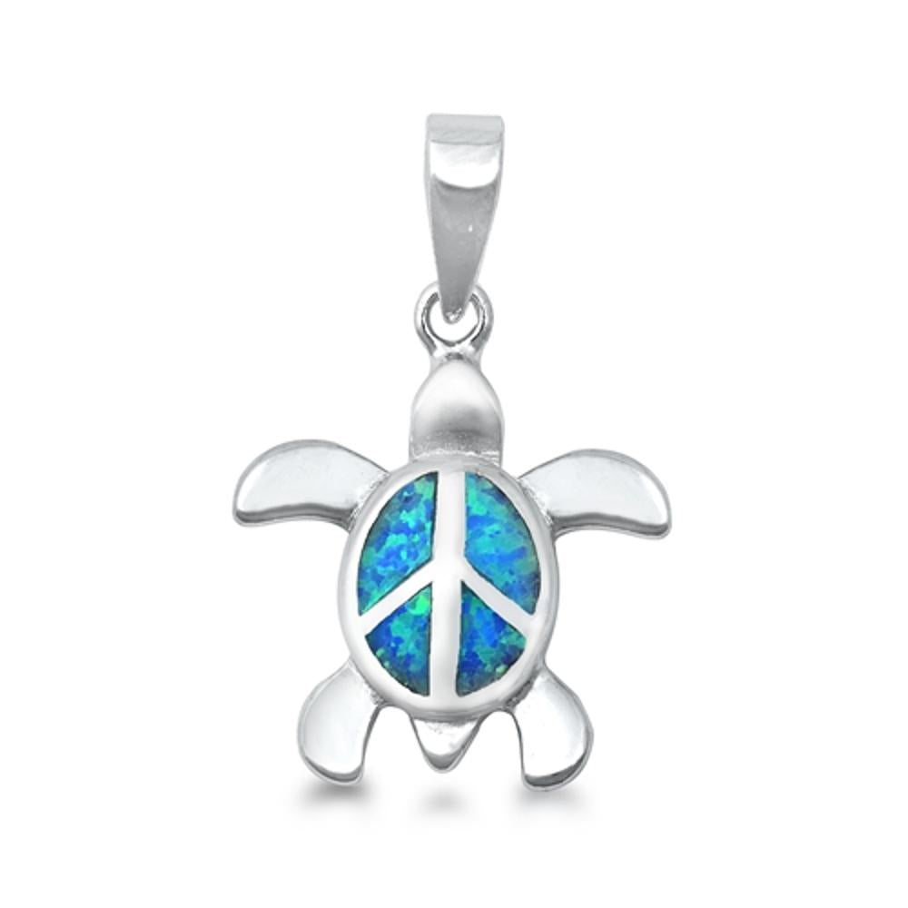 Peace Sign Turtle Pendant Blue Simulated Opal .925 Sterling Silver Ocean Charm