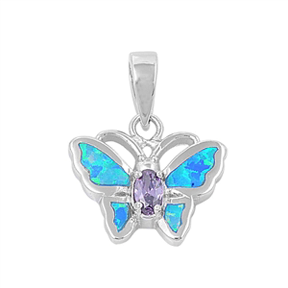 Wing Tiny Butterfly Pendant Blue Simulated Opal .925 Sterling Silver Cute Charm