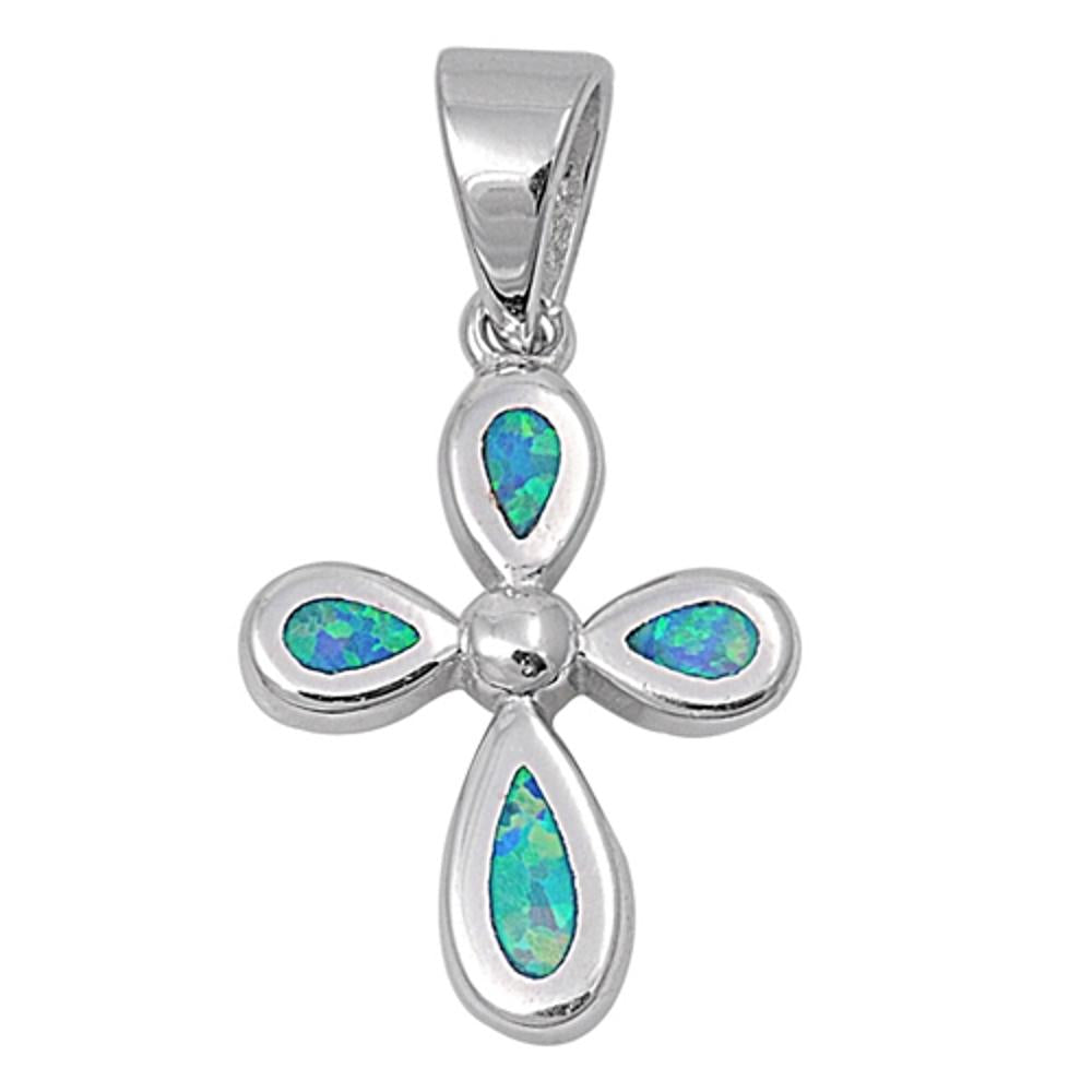 Sterling Silver Classic Blue Synthetic Opal Cross Pendant Christian Charm 925