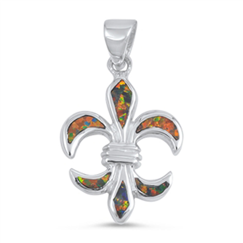 Sterling Silver Flower Symbol Fleur De Lis Pendant Mystic Simulated Opal Charm