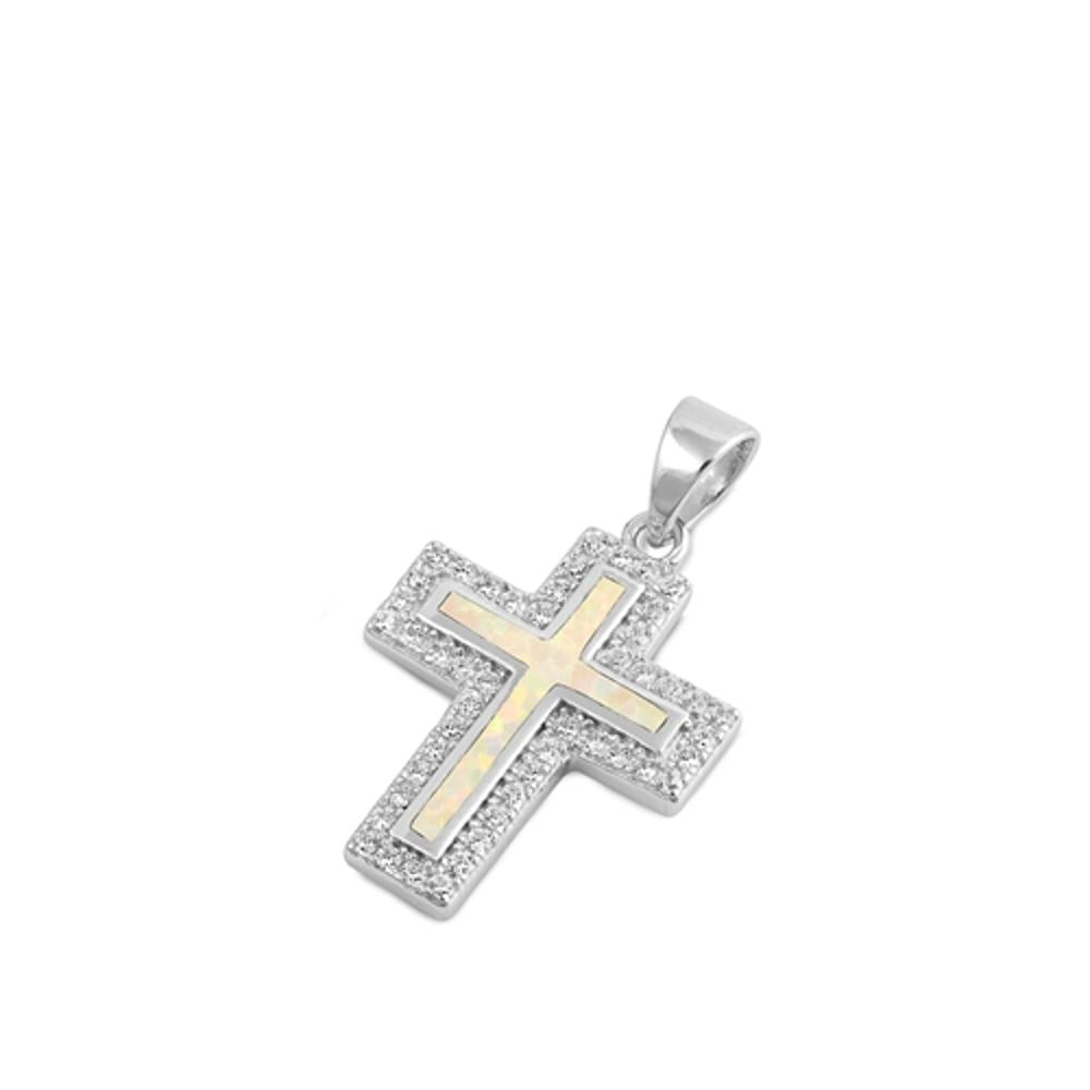 Sterling Silver White Synthetic Opal Elegant Studded Cross Pendant Halo Charm