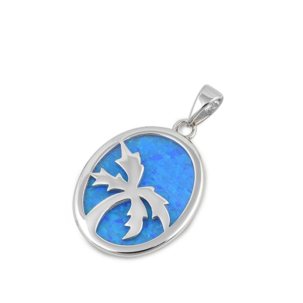 Sterling Silver Blue Synthetic Opal Palm Tree Pendant Tropical Nature Charm 925