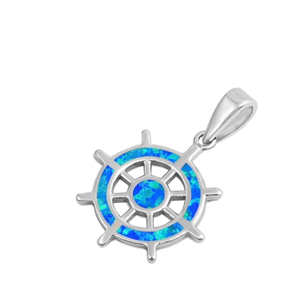 Sterling Silver Blue Synthetic Opal Captains Wheel Pendant Ship Ocean Charm 925