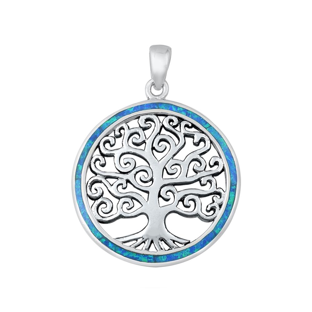 Sterling Silver Blue Synthetic Opal Tree of Life Medallion Pendant Curl Charm
