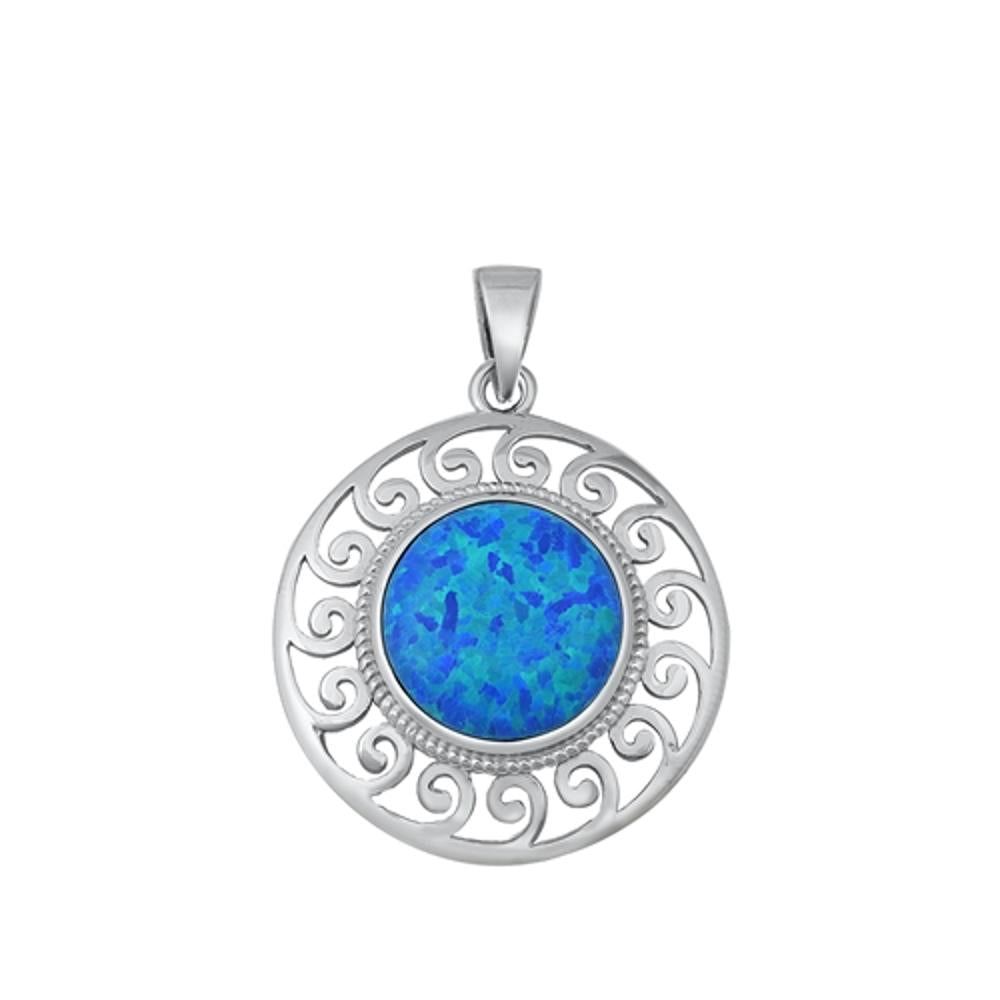 Sterling Silver Blue Synthetic Opal Sun Medallion Pendant Wave Swirl Curl Charm