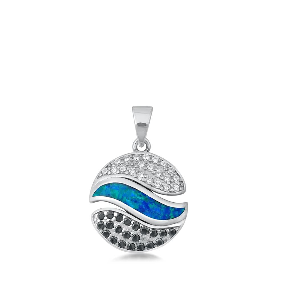 Sterling Silver Unique Wavy Circle Blue Synthetic Opal Pendant Artistic Charm