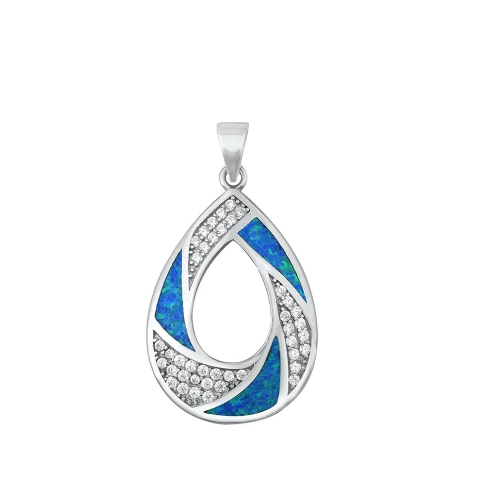 Sterling Silver Blue Synthetic Opal Spiral Clear CZ Teardrop Pendant Open Charm
