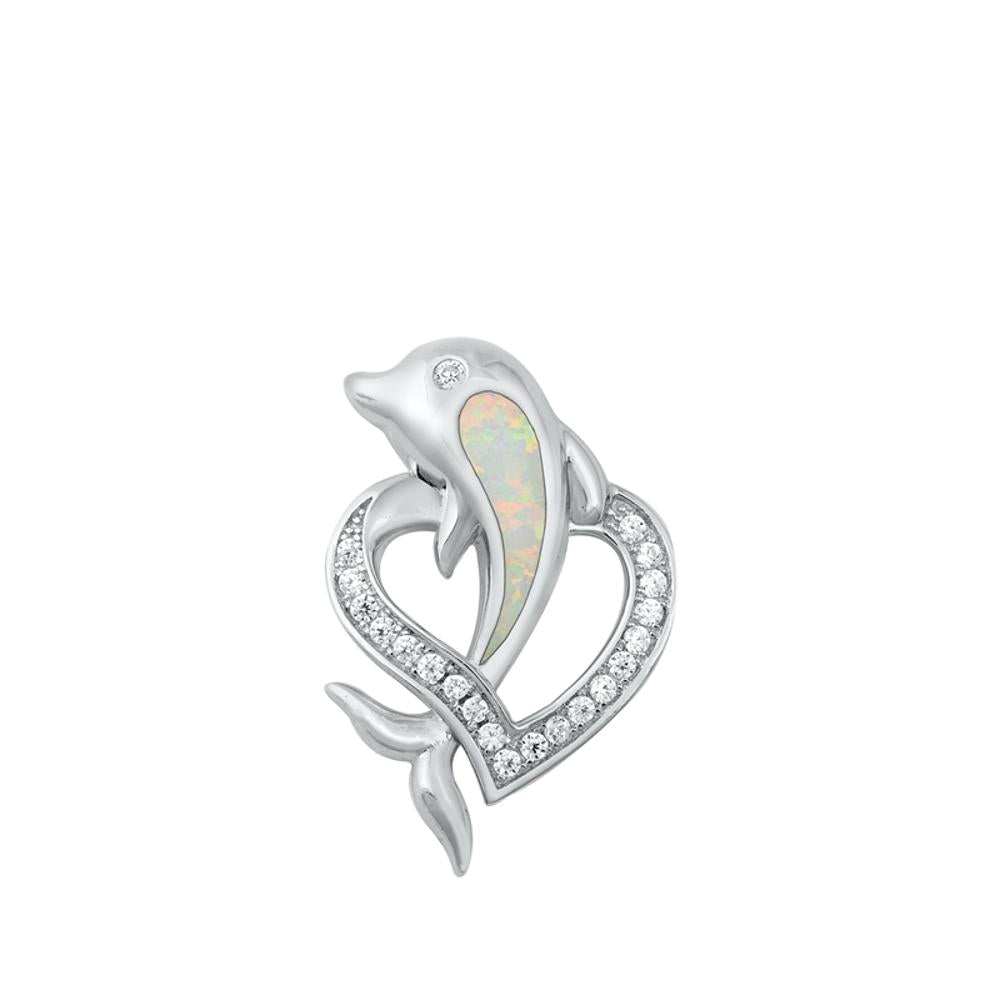 Sterling Silver White Synthetic Opal Dolphin Pendant Heart Ocean Love Charm 925