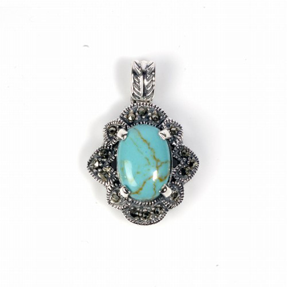 Sterling Silver Elegant Vintage Turquoise Pendant Marcasite Cluster Charm 925
