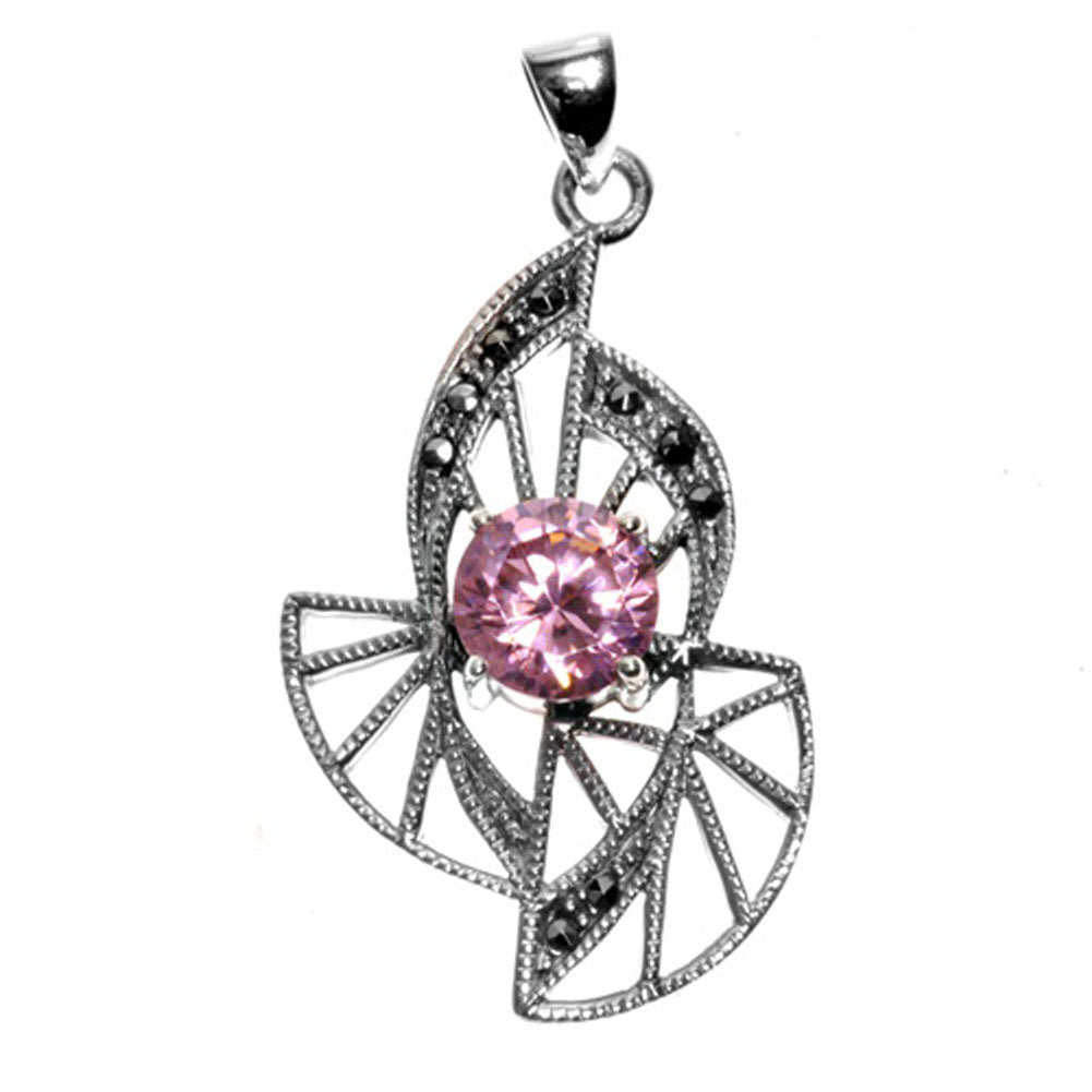 Art Deco Style Leaf Pendant Pink Simulated CZ .925 Sterling Silver Round Charm