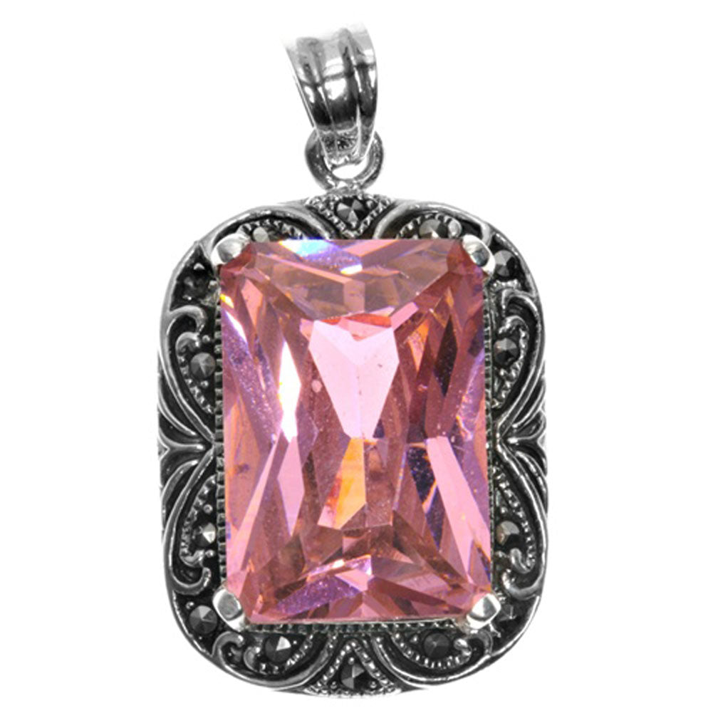 Filigree Swirl Rectangle Pendant Pink Simulated CZ .925 Sterling Silver Charm