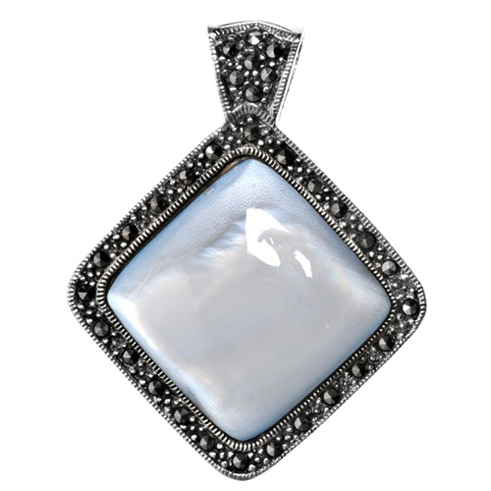 Sterling Silver Classic Studded Square Pendant Simulated Mother of Pearl Charm