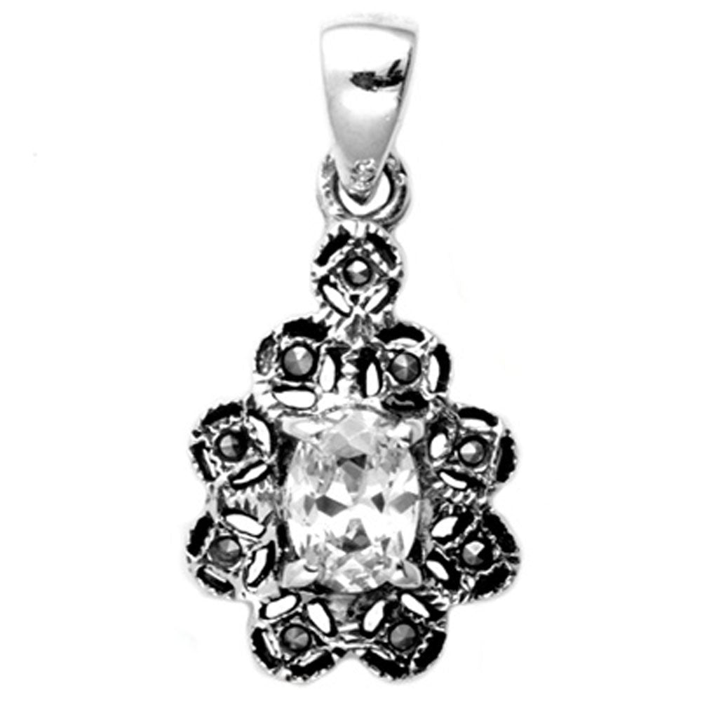 Vintage Studded Oval Pendant Clear Simulated CZ .925 Sterling Silver Charm