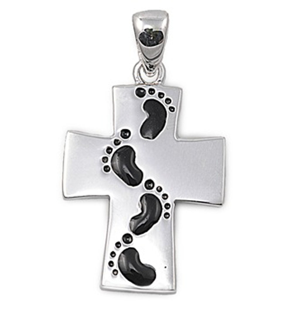 Unique Oxidized Cross Pendant .925 Sterling Silver Footprint Baby Feet Charm