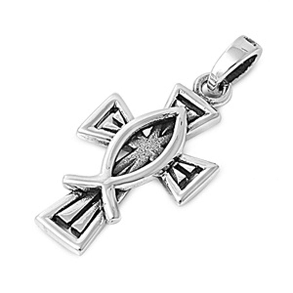 Ichthus Fish Ornate Cross Pendant .925 Sterling Silver Angled Religious Charm