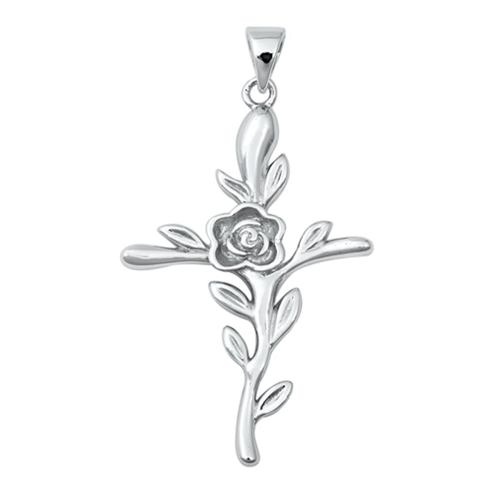 Sterling Silver Rose Vine Cross Pendant Leaf Branch Elegant Flower Charm 925 New