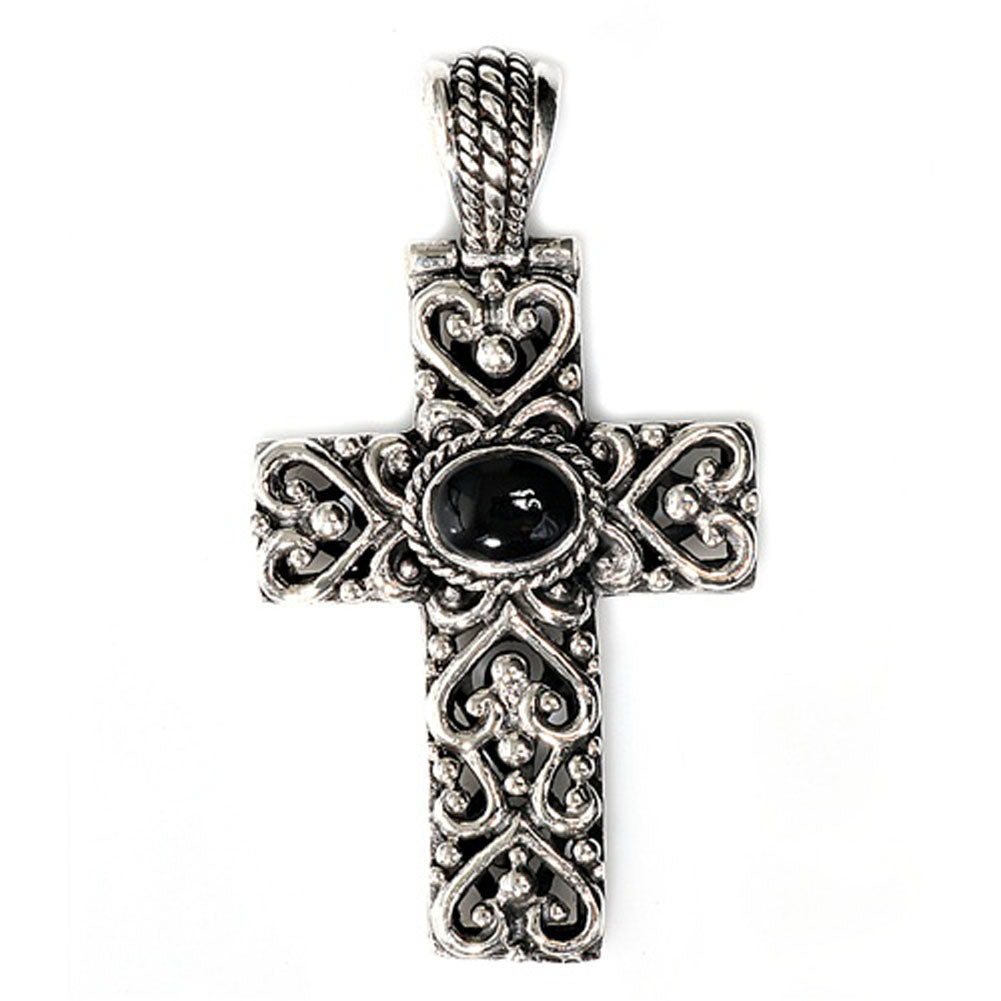 Sterling Silver Heart Gothic Spiral Heart Cross Pendant Black Simulated Onyx